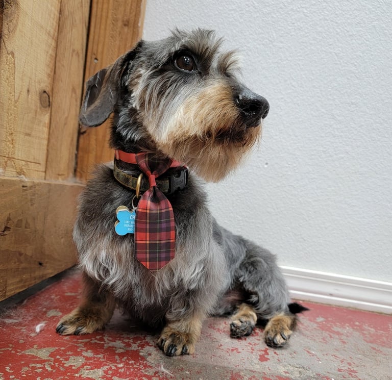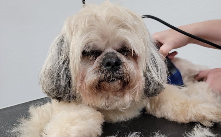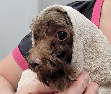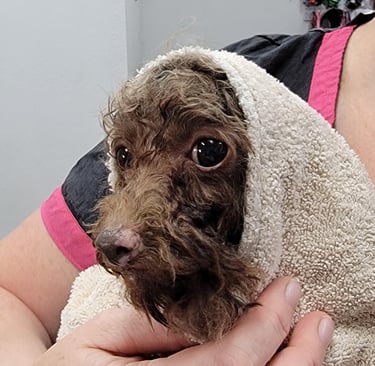A 5-10 charge may be added for intensive de-matting. Due to the risk of brush burn, if matts are tight to the skin we will clip them out for the well-being of the dog.